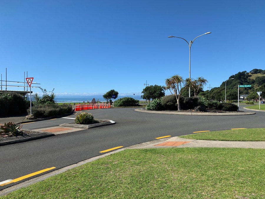 The rotary connecting West End Road and Villis Glade, with the public toilets on the left and the entrance to the beach parking lot.