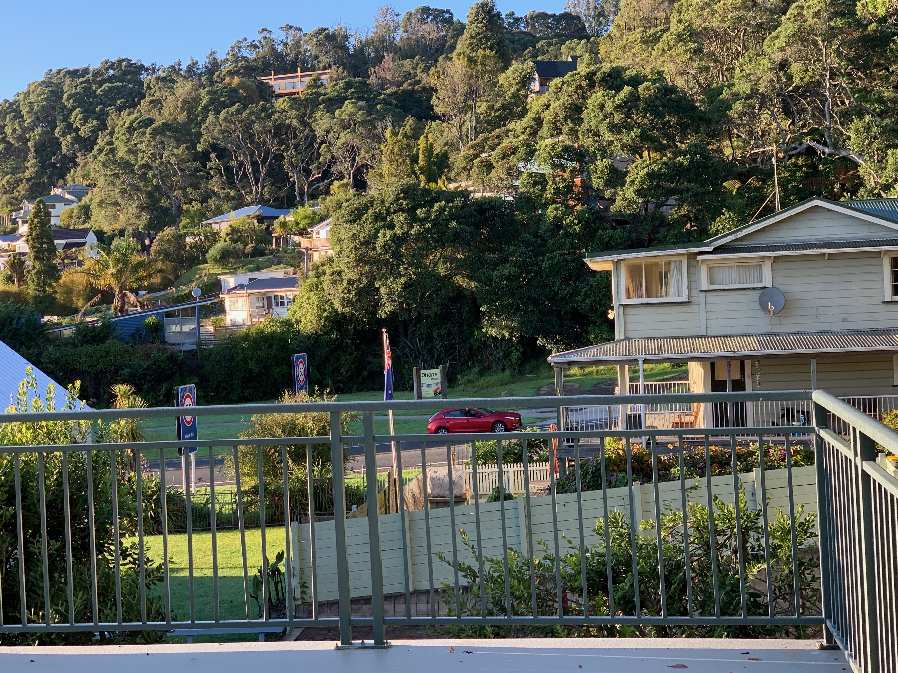 I spy Mr. Bill driving up Ohope Hill Road, between the old postal workers’ bach and Froglands.
